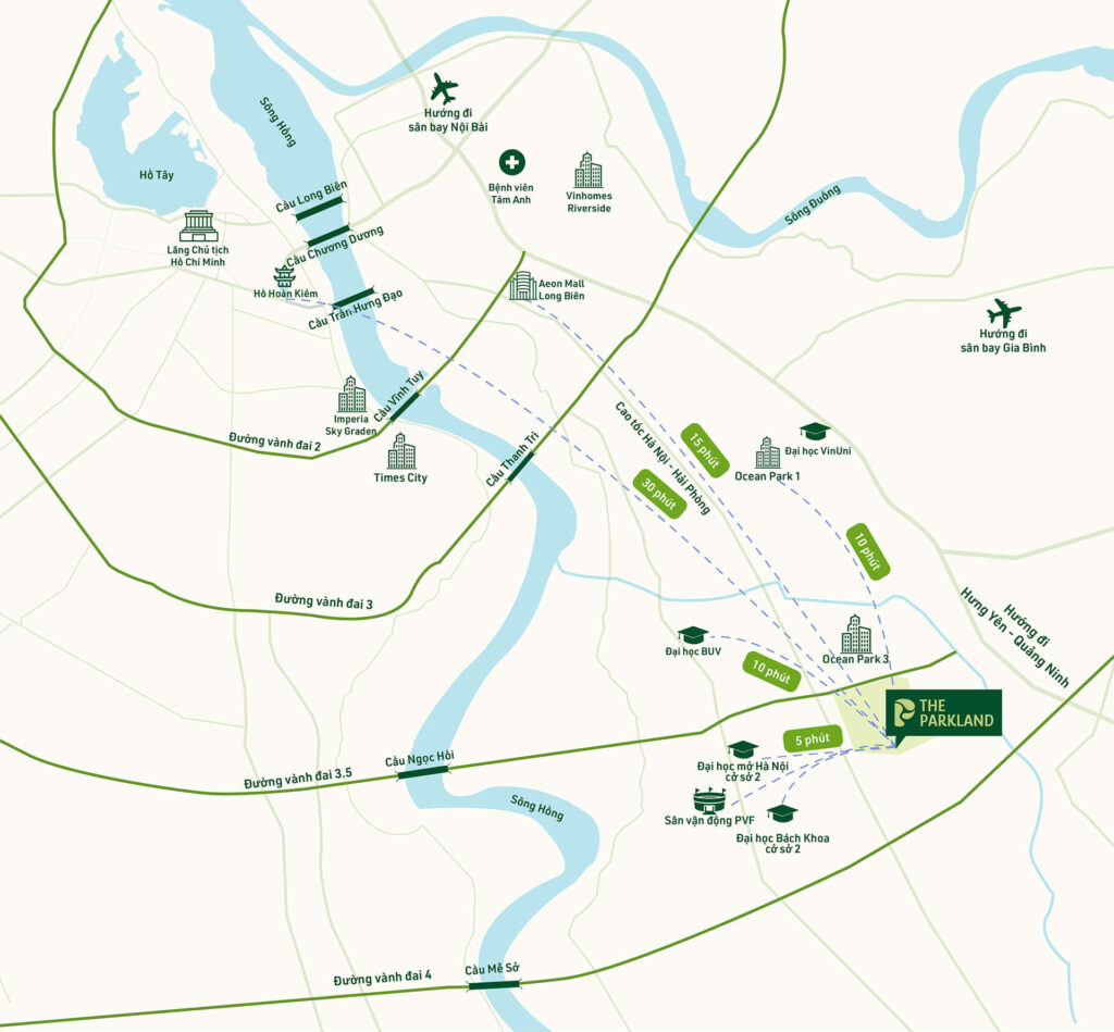 • Vào trung tâm: Khoảng 15–20 phút để di chuyển tới trung tâm Hà Nội qua cao tốc Hà Nội – Hải Phòng hoặc Quốc lộ 5A.
